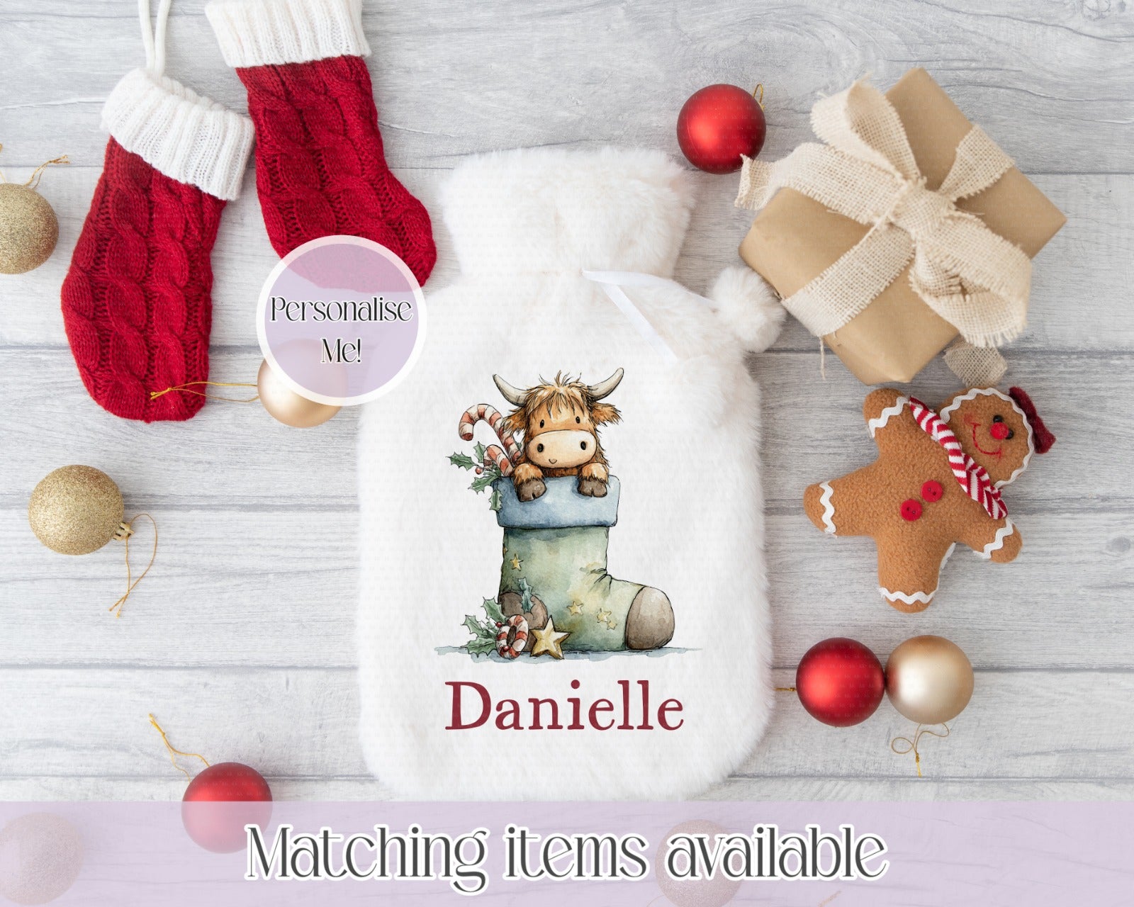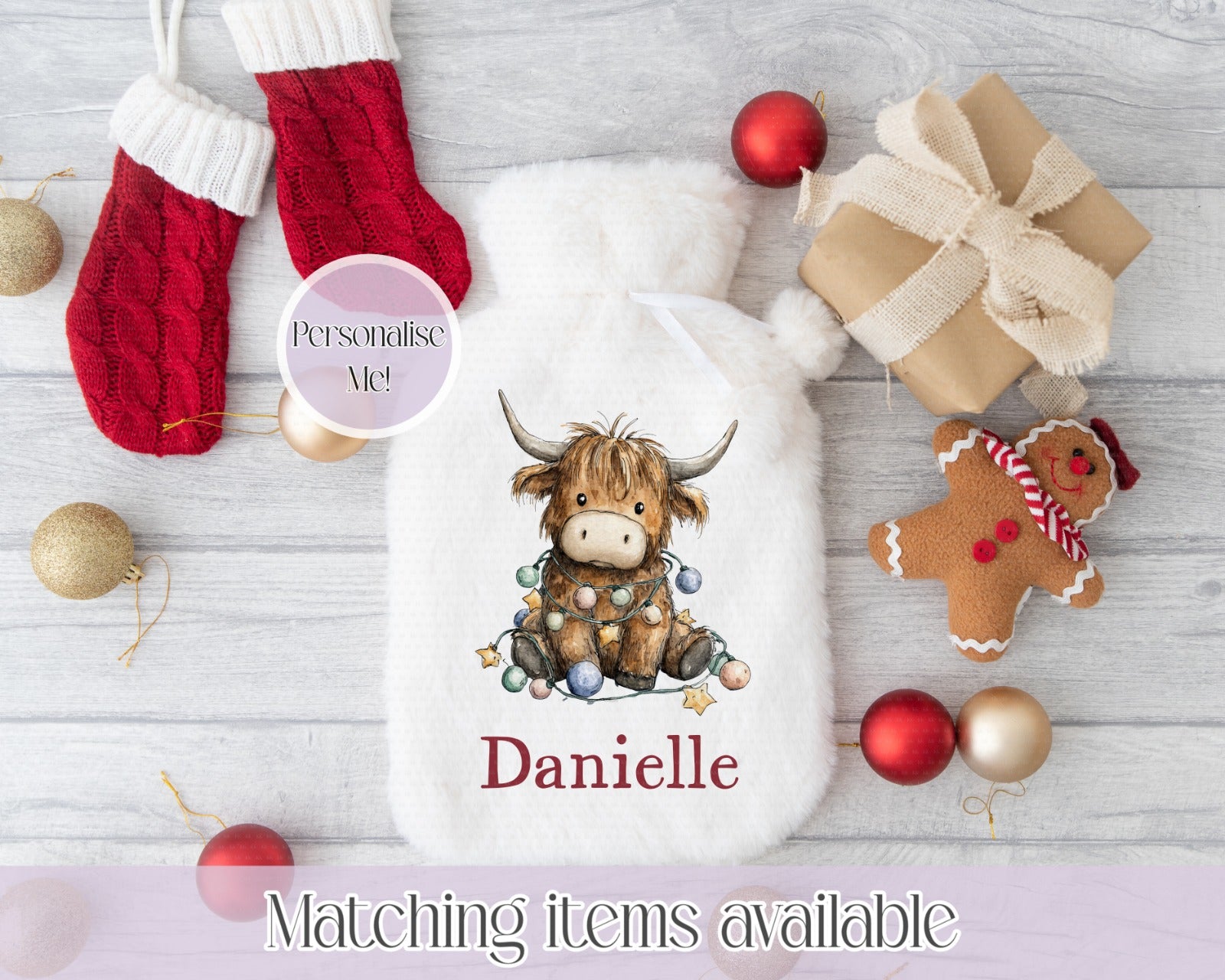 Christmas Cute Highland Cow Hot Water Bottle- Cosy Christmas - custom name
