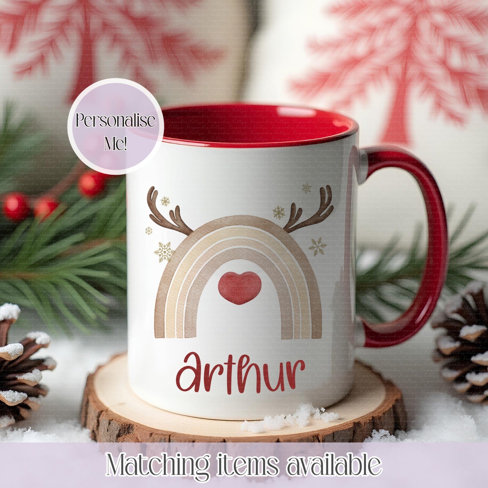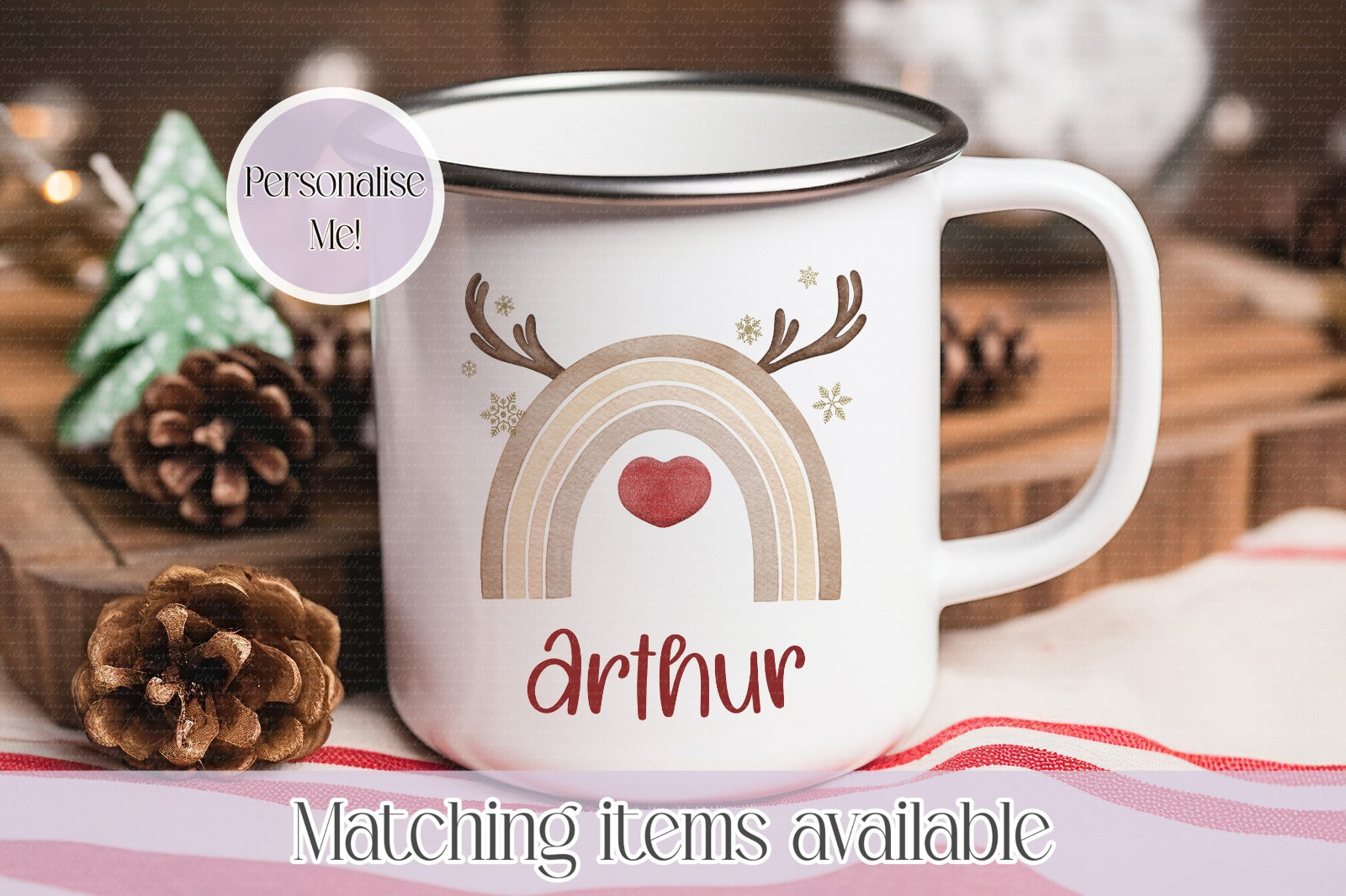 Personalised Christmas Reindeer Rainbow Mug – Enamel or Ceramic | Custom Name | Christmas Hot Chocolate Mug