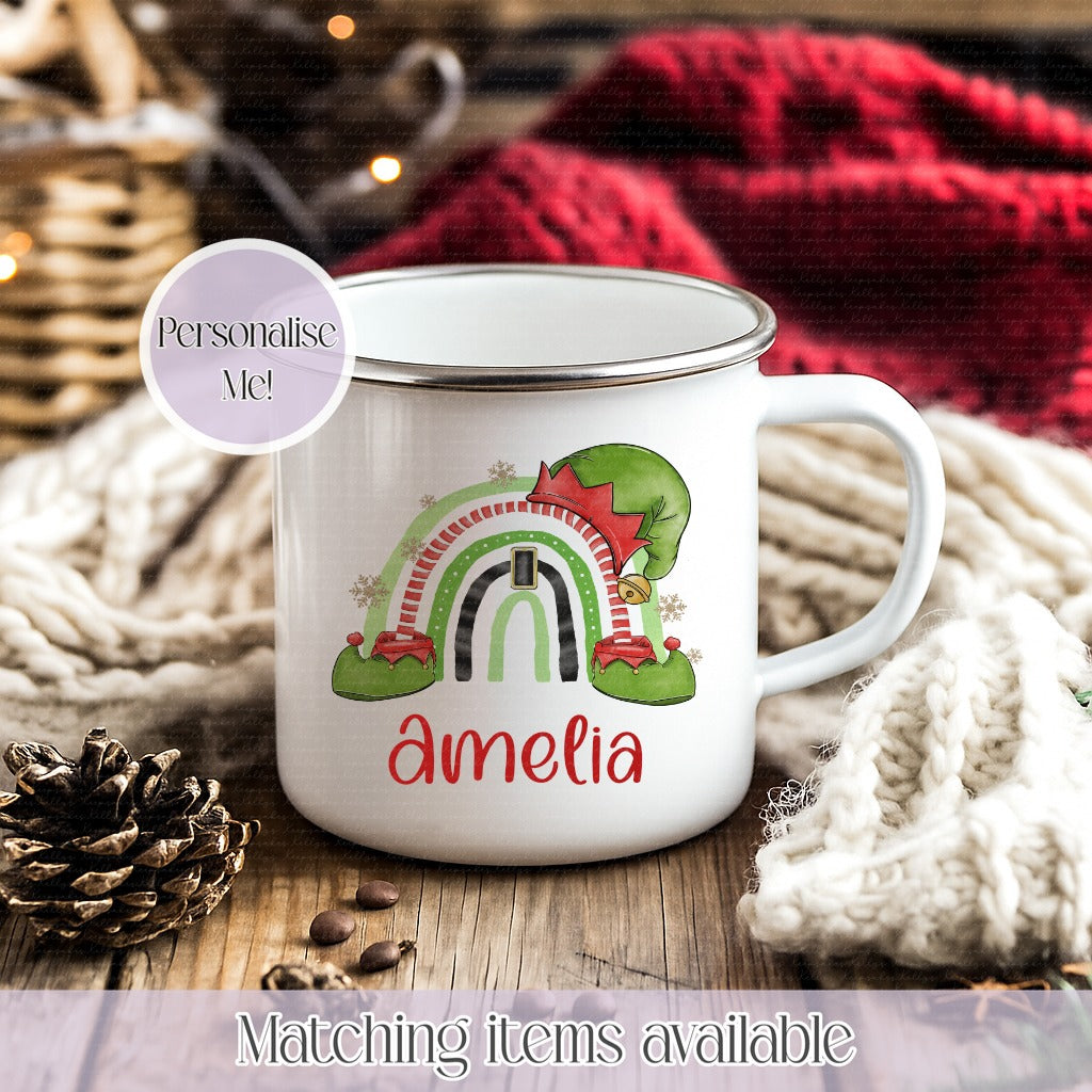 Personalised Christmas Elf Rainbow Mug – Enamel or Ceramic | Custom Name | Christmas Hot Chocolate Mug