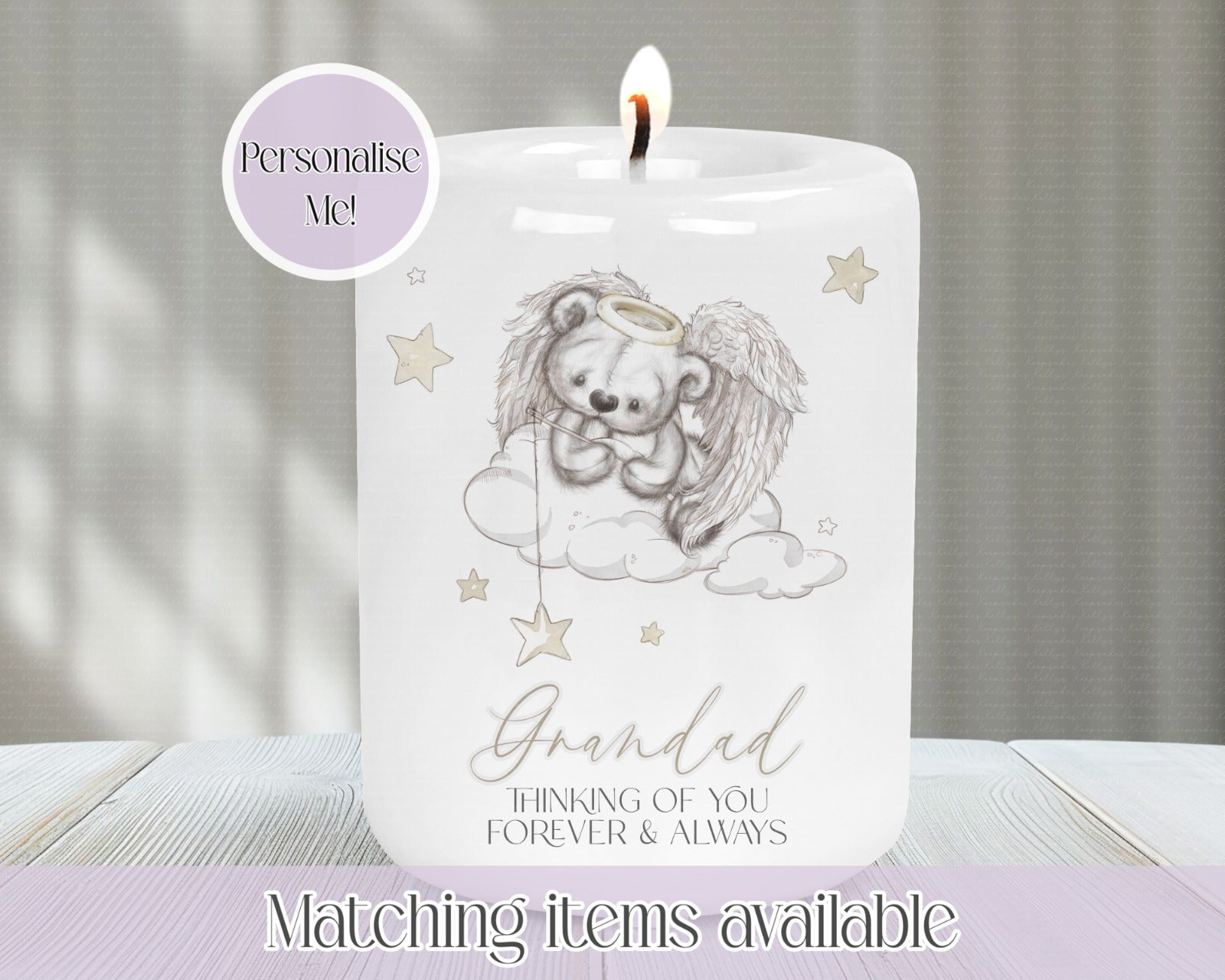 Personalised Memorial Angel Teddy Catching Stars Cloud Ceramic Candle Holder - thinking of you forever and always - Memorial Candle