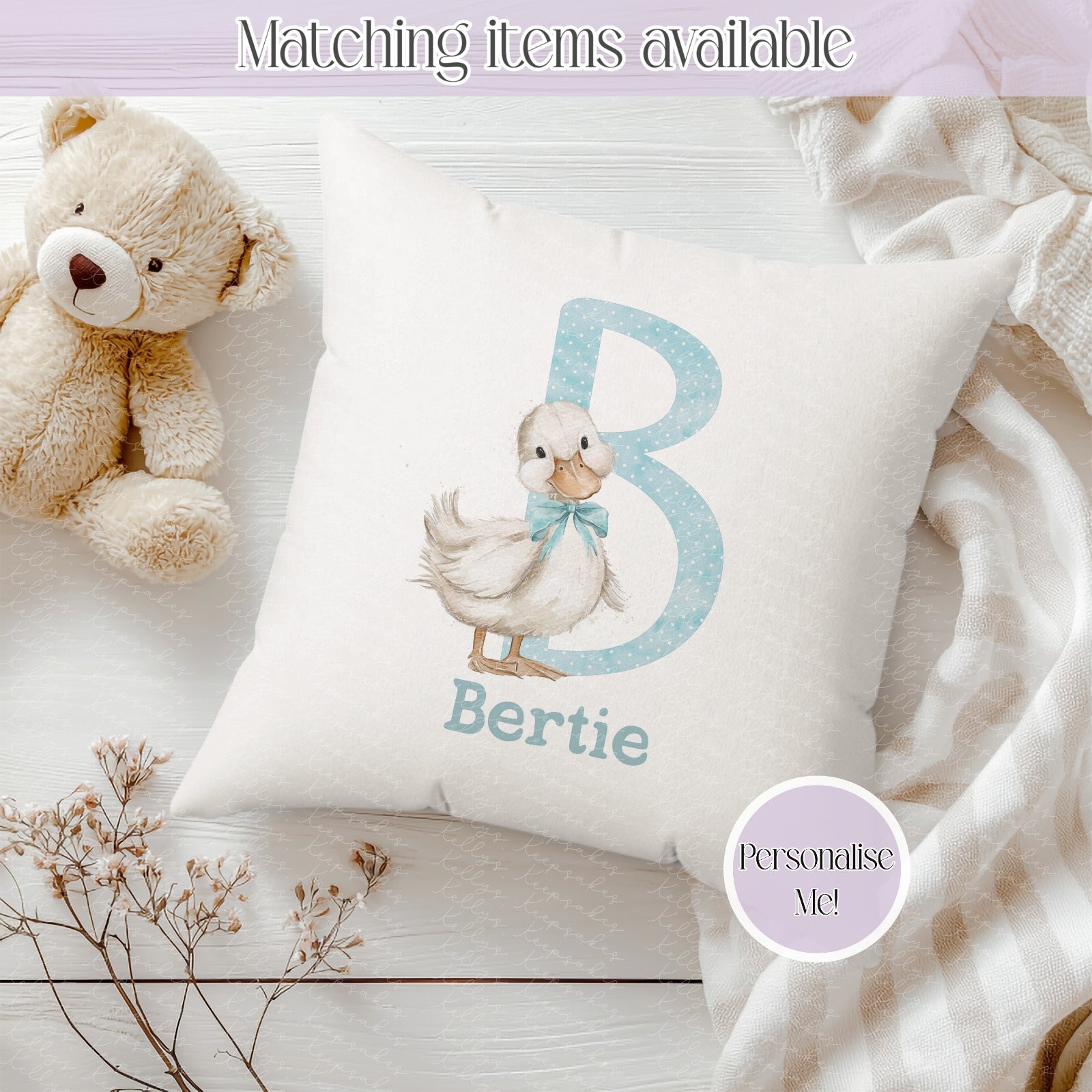 Each cushion features an adorable goose illustration paired with a personalised name, making it a thoughtful keepsake gift for children or a charming décor piece for your home.
