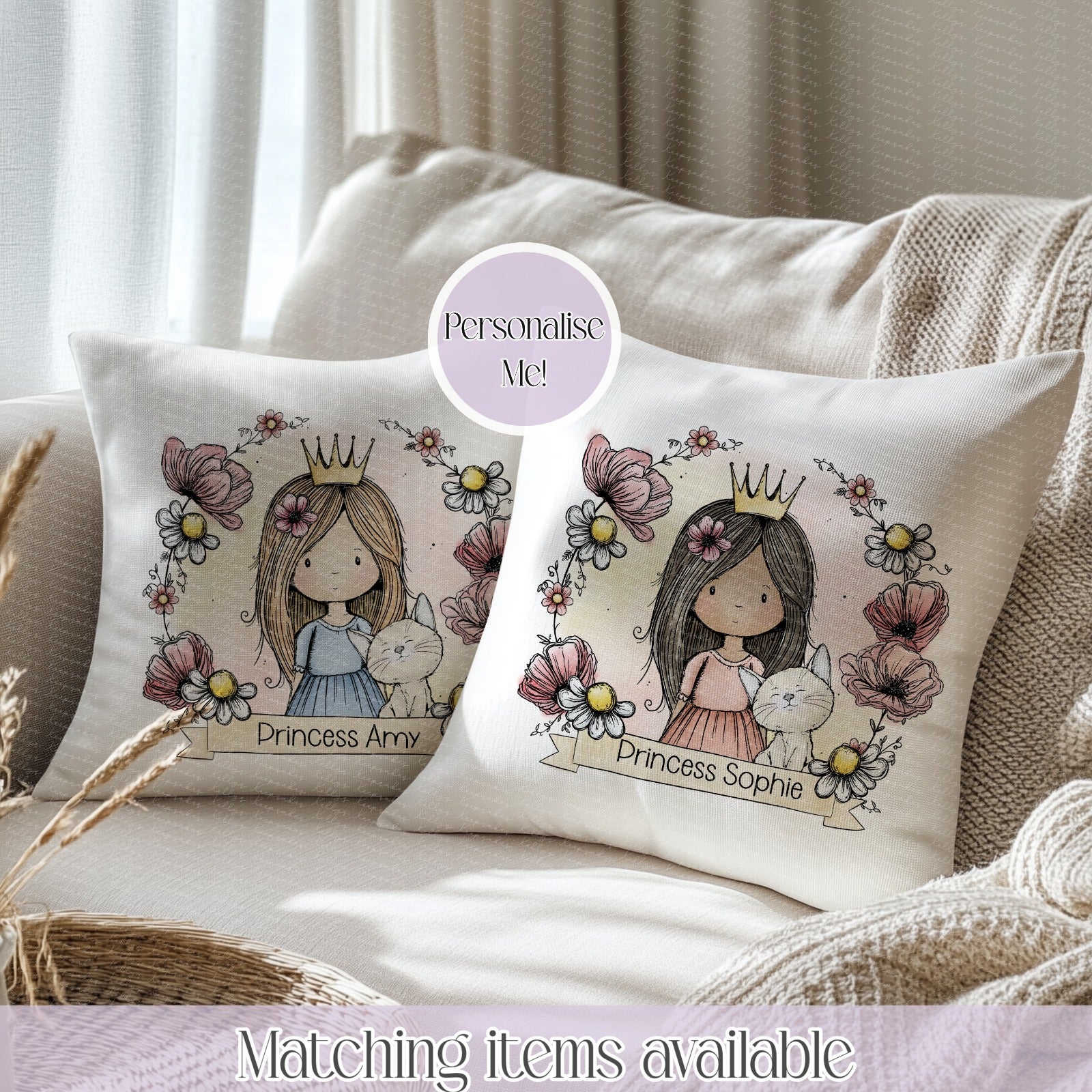 Each cushion features an adorable princess illustration paired with a floral frame and name, making it a thoughtful keepsake gift for children or a charming décor piece for your home.